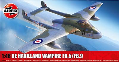 The latest release of the Vampire is the FB5/FB.9 version. This kit contains 124 parts and the choive of 3 colour scheme options, this is currently on the Airfix site (October 2025).